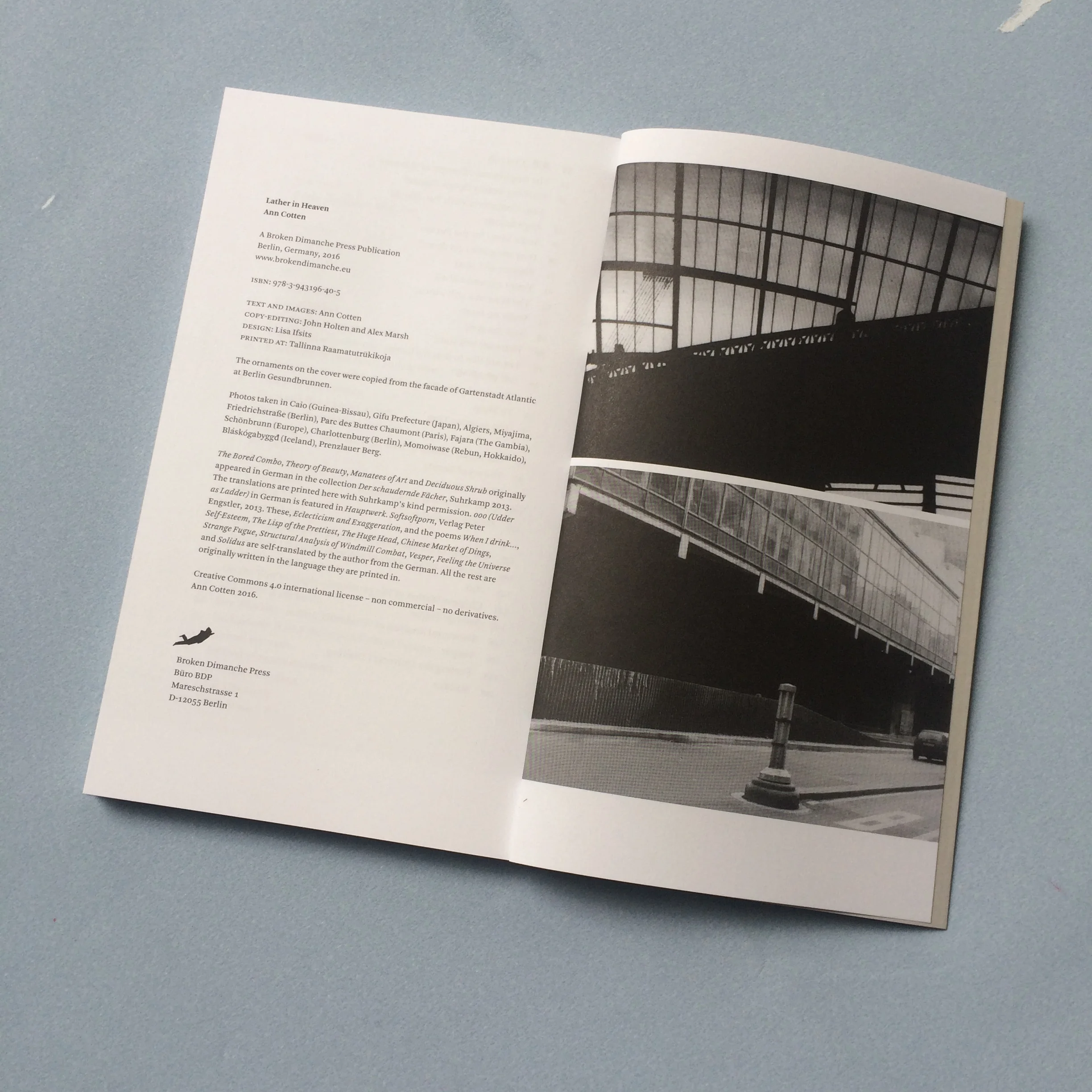 After the delicate first concept album I, Coleoptile (2010), Ann Cotten now comes out with a full-fledged book of English poetry and prose. Lather in Heaven assembles her work in English up to now, as well as some selected translations from the German. English, however, is a wide field. The author, known for stretching the limits of German expression, writes in an English informed more by several global variants of pidgin than by universities or writing schools. If it sounds like Shakespeare, it also sounds like slips from Chinese fortune cookies.
